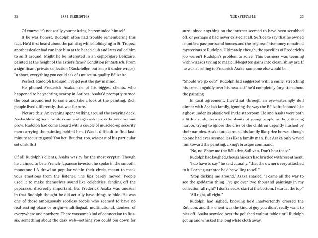 “A high-powered page-turner, The Spectacle does a deep dive into what lies beneath the shiny veneer of the art world. With unique insights and cutting satire, Anna Barrington reveals the ambition, greed, and fraud that fuels this multibillion-dollar business—not to mention a bracing love story. Highly recommended.”B. A. Shapiro, New York Times bestselling author of The Art Forger and The Lost Masterpiece