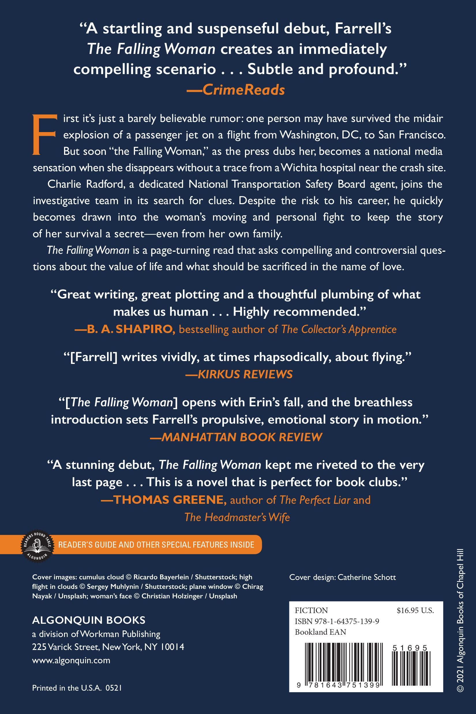 "A stunning debut, The Falling Woman kept me riveted to the very last page. Without sacrificing an ounce of suspense, Farrell manages to ask the big questions about life and love. This is a novel that is perfect for book clubs."