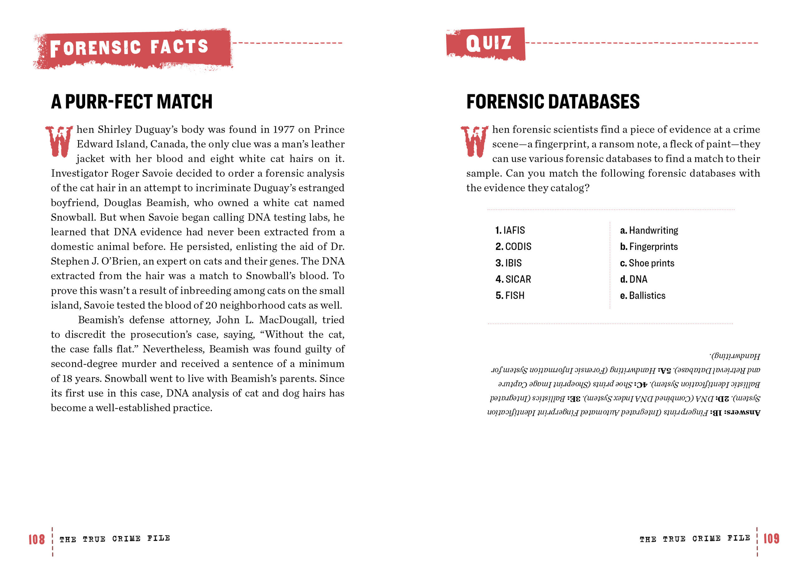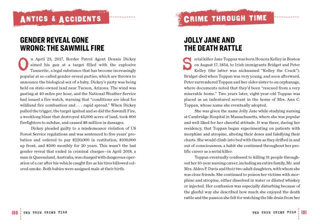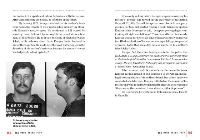 Here are the big names—Bundy, Manson, Berkowitz, Borden, and the Black Dahlia. The lingering mysteries—like JonBenet Ramsey and Natalie Wood. The disturbing puzzle of the Zodiac Killer. The true story behind the most lurid headline ever: “Headless Body in the Topless Bar.” Plus a feast of trivia and more, including the Psychopath test, how DNA profiling began, tattoo analysis, and quizzes like “Where Did They Hide?” and “Serial Killer Trophies.”